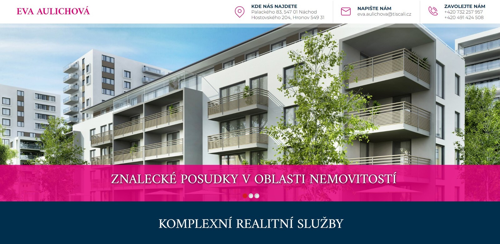 Eva Aulichová poskytuje již od roku 1996 komplexní služby v oblasti nemovitostí, v Náchodě a okolí. Specializuje se na znalecké posudky v oblasti ekonomiky a realit. Zajišťuje také komplexní realitní služby od A do Z.