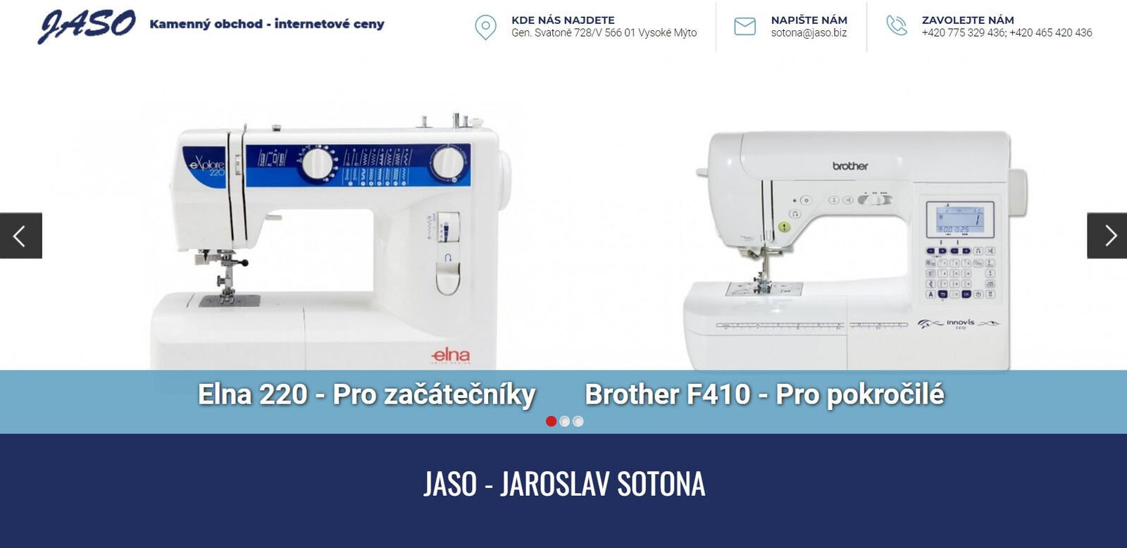Firma JASO - JAROSLAV SOTONA se zabývá prodejem a opravami šicích strojů pro domácí i profesionální použití, převážně značek Brother, Juki, Lada, Gritzner, Bobbin, Elna nebo Baby Lock.