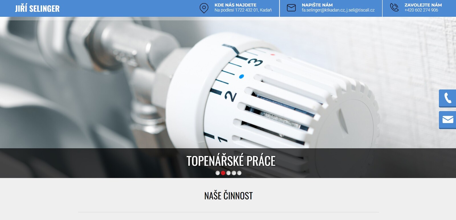 Firma Jiří Selinger z Kadaně provádí komplexní služby v oblasti topenářských a instalatérských prací, včetně souvisejících svářecích prací. Jiří Selinger provádí realizaci všech druhů topení, včetně kotelen a komplexních topných systémů. Provádí také stavbu výměníkových stanic, montáže domovních rozvodů, řešení úniku vody v zemi korelátorem nebo regulaci a měření ústředního topení.