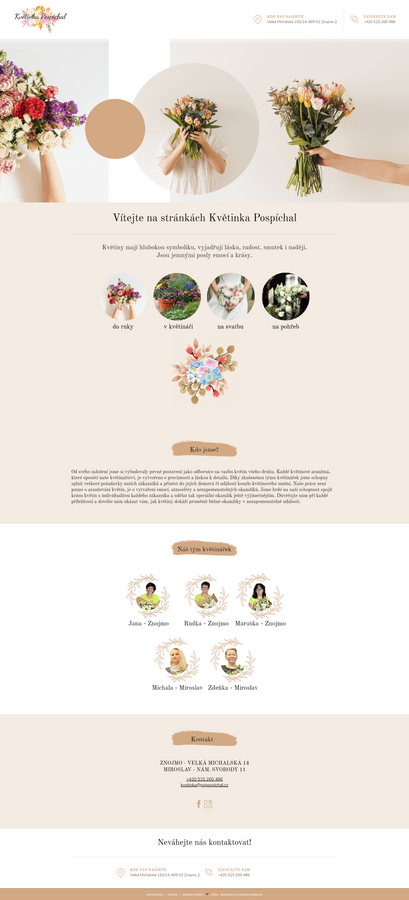 Květinka Pospíchal ve Znojmě je specialistou na smuteční floristiku, nabízejícím vazby, věnce, kytice a kompletní dekorace hrobů. Nabízí odborné poradenství a široký výběr květin pro poslední rozloučení s blízkými, vždy s ohledem na osobnost zesnulého a symboliku květin. Zajišťují také svatební květinovou výzdobu.