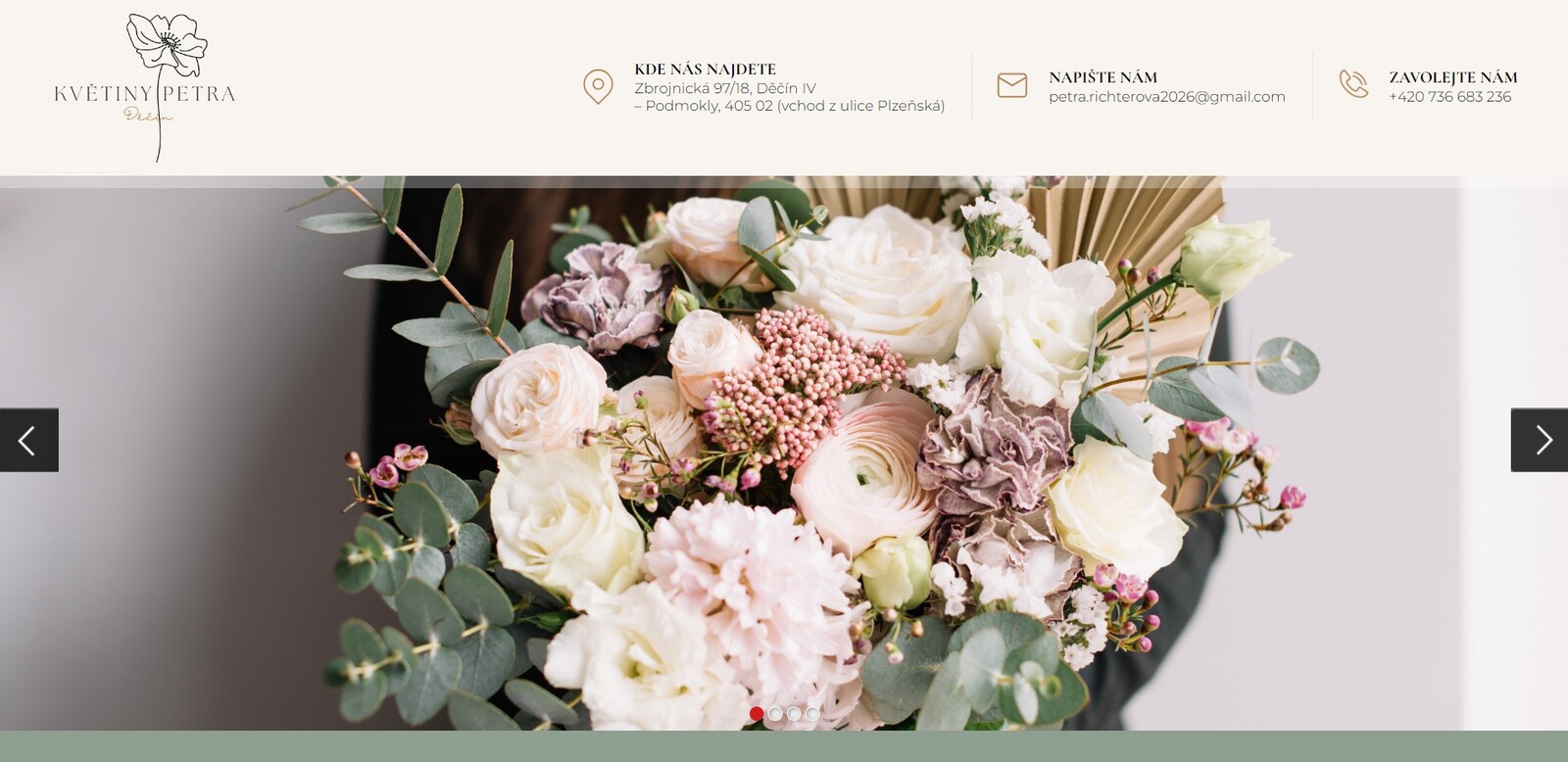 Květiny Petra z Děčína se specializují na prodej květin, realizaci květinových vazeb a širokou škálu služeb pro různé příležitosti. Nabízí nezapomenutelné svatební kytice, smuteční vazby, dárkové kytice plné lásky a péče, dekorace pro interiéry a exteriéry, vánoční dekorace a další. S citlivostí, vášní a mnohaletými zkušenostmi tvoří jedinečné květinové kompozice, které vám přinesou radost a potěší vaše smysly.