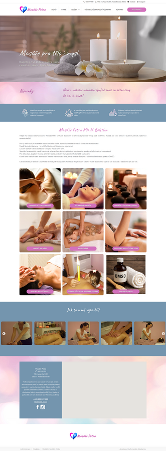 Masáže Petra v Mladé Boleslavi jsou zavedeným masážním salónem zaměřeným na regeneraci těla, úlevu od bolestí pohybového aparátu i hlubokou psychickou relaxaci. Nabídka zahrnuje široké spektrum masáží a terapií – od relaxačních a terapeutických masáží na míru, přes manuální lymfodrenáž, baňkování a masáže lávovými kameny až po havajskou masáž lomi-lomi či indickou masáž hlavy. Ošetření probíhají v příjemném a klidném prostředí s využitím výhradně 100% přírodních za studena lisovaných olejů, s důrazem na individuální přístup a celkovou harmonizaci těla i mysli.